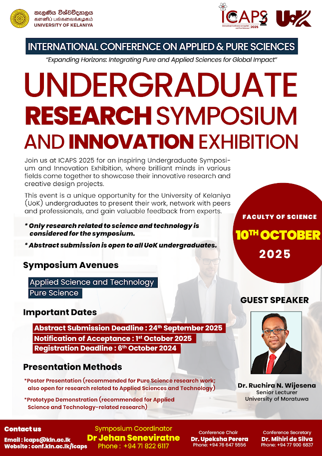 The Undergraduate Research Symposium and Innovation Exhibition (URSIE) will be held for the second time in conjunction with ICAPS 2025 on 10 October 2025. The URSIE is open only to undergraduates of the University of Kelaniya (UoK).
