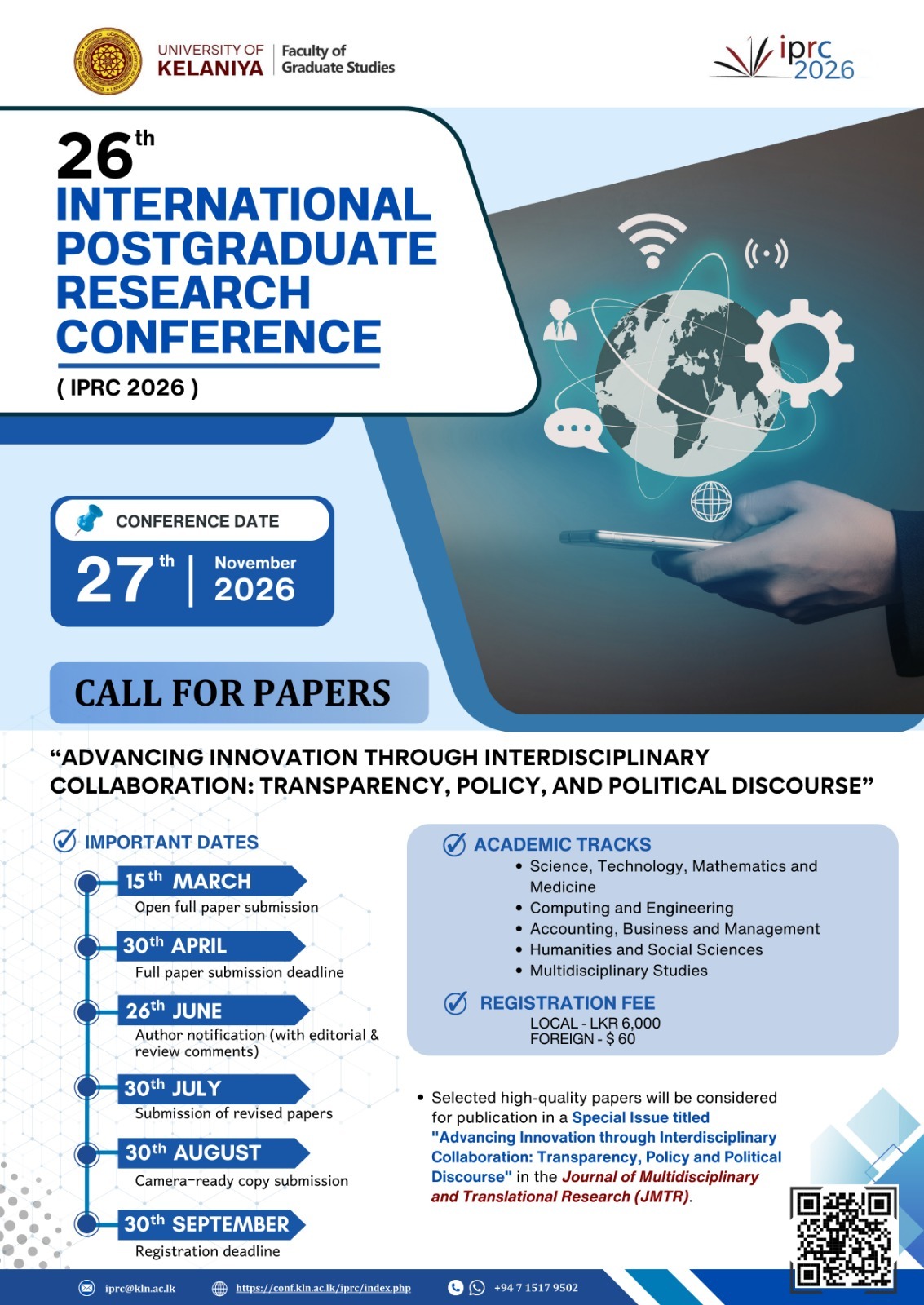 The 26th International Postgraduate Research Conference (IPRC 2026), organized by the Faculty of Graduate Studies, University of Kelaniya, Sri Lanka, will be held in 2026 under the theme: